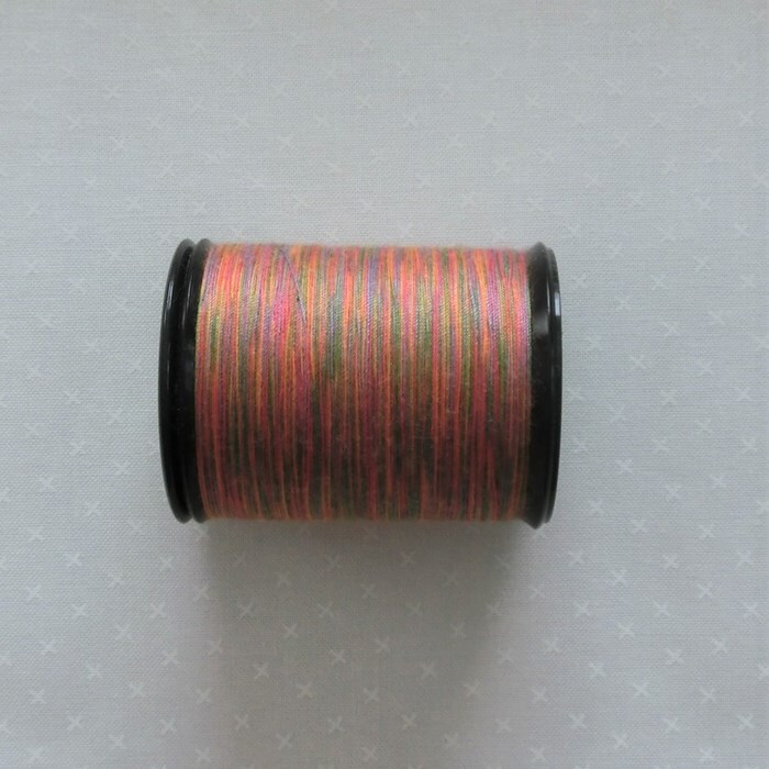 ハンド、ミシンキルト、両方に使えるキルト用糸です。太さは40番糸。距離は300メートル巻かれています。素材はポリエステル100%です。その名のとおり、色合いがグラデーションに変化して出てくるキルト糸で、無地のところにキルトをすると、色の移り変わりがとっても美しく出ます。また、反対に、色々な色の生地を縫い合わせた時には、糸を変えずに全体をキルトするのに使えたりします。商品No・9は可愛らしい色合いの、ピンク、赤、紫、グリーン、黄色のグラデーションです。