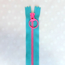 ポップな色合いがカワイイ、ファスナーです。リング状の引手がつかみやすく、開け閉めがラクラクです。