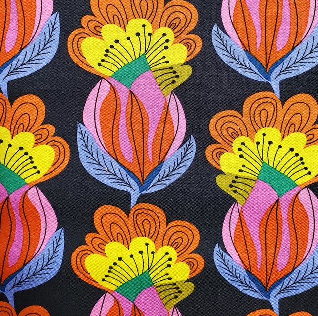 今、流行りのアフリカン・ファブリックのような、大き目で独特なお花が印象的な生地です。