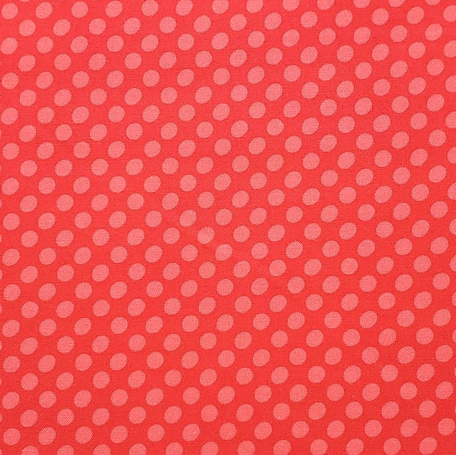 赤い土台に薄めの赤のドットがキュートな生地です。アップリケや刺繍。パターンの土台につかっても面白い作品に!