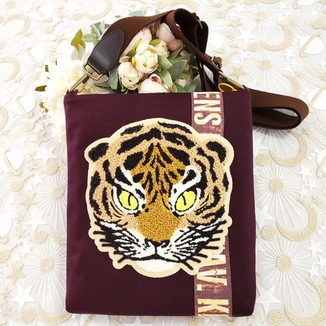 手作り完成品のポシェットです。丸山応挙のトラの絵がモチーフのワッペン「とらきち」が迫力の、カッコ良いポシェットです。