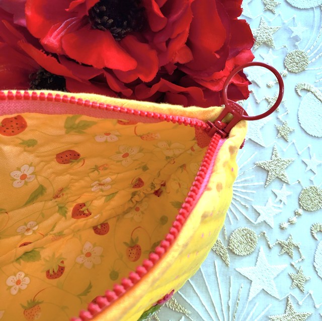 内袋は、黄色の可愛い小花柄の生地を使いました。