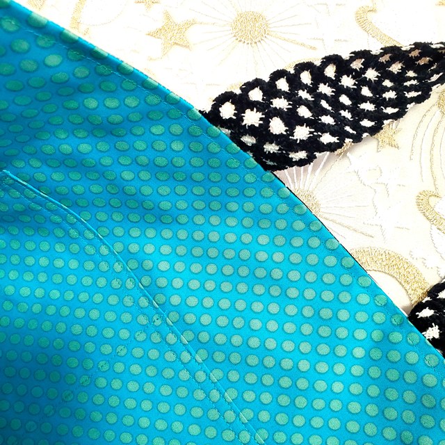 内袋は爽やかなブルーのドット柄の生地を使用しました。使用している時に、チラリと見える赤がステキです。