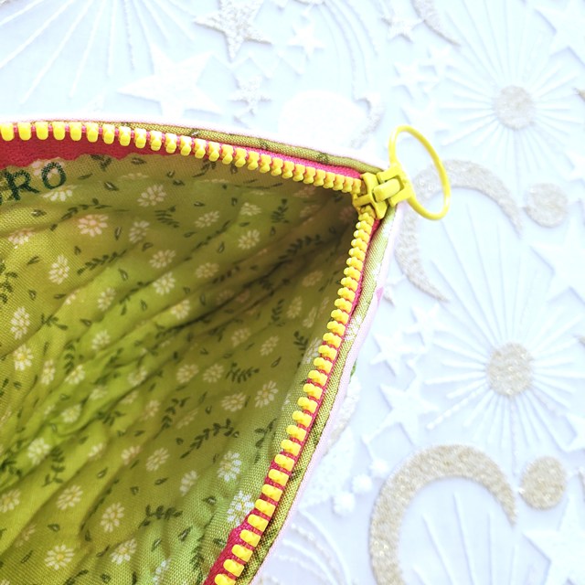 ファスナーは「ピンク&イエロー」のコンビカラー(20cm)を使いました。引手も大きく、沢山開きます。