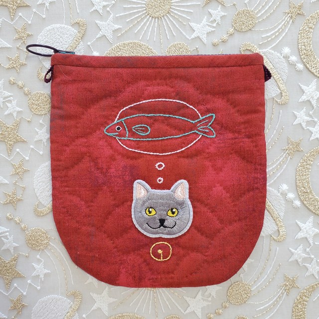 キット見本・ワッペンにゃんこのポーチ(魚ネクタイ)